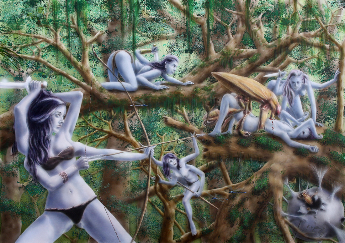 Die Amazonen der Maghiri nähern sich dem Rotaugenkäfer, eine Schwachstelle in seinem Panzer suchend, um ihre Gefährtin vor dem bevorstehenden Tod durch Aussaugen zu bewahren...
