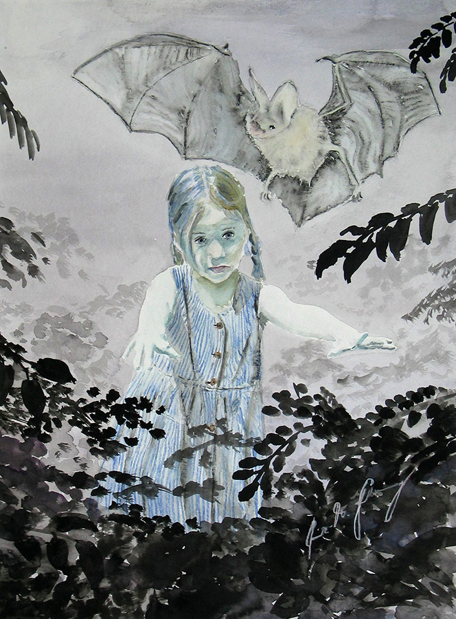 Anna kann der Fledermaus kaum folgen, weil sie in der Dunkelheit nichts sehen kann ; nahezu blind tastet sie sich durch das dichte Gestrüpp.... |
