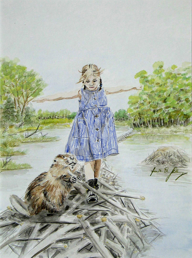 Der Biber lotst Anna über den Damm, den die Biber zum Aufstauen des Wassers gebaut haben, damit ihre Wohnbauten geschützt sind. Wo wenig Trittstellen sind, bessert er noch schnell mit frisch abgebissenen Ästen nach. |