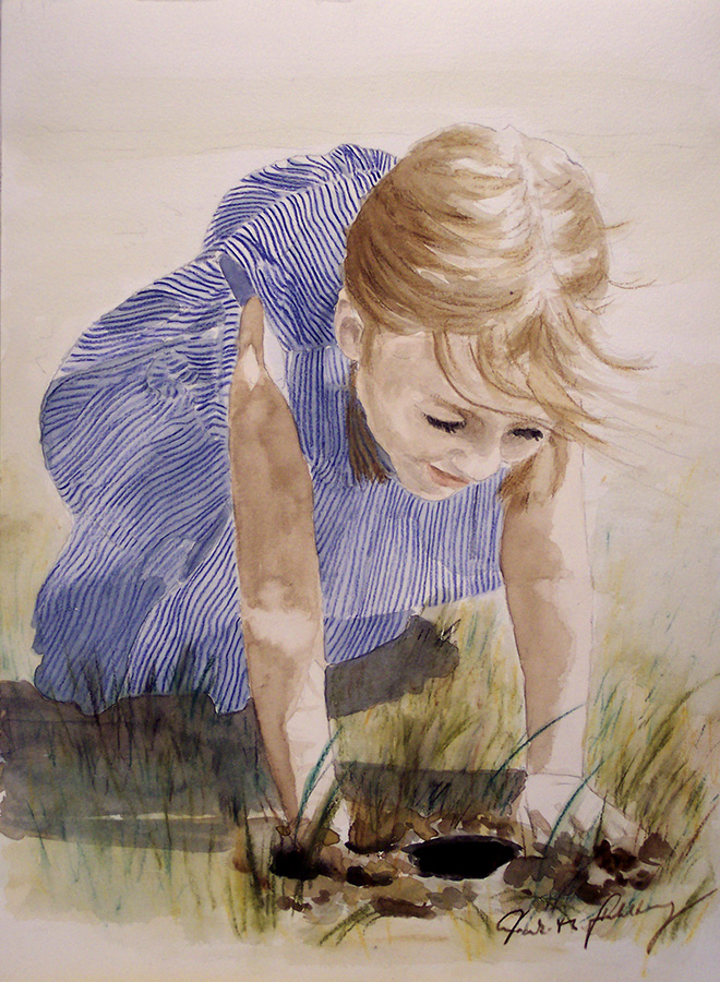 Anna versucht dem Maulwurf nachzusehen, der sich in Windeseile unter der Erde entlanggrub