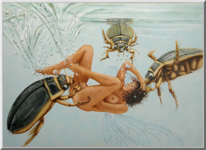 Beim Wettschwimmen mit ihrem Freund Welard wird die Elfe Wira von Gelbrandkäfern