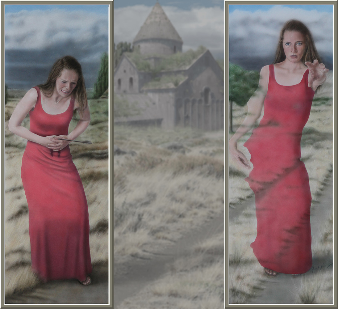 einmal verletzt und einmal als verschwindendes Trugbild. Diese beiden sind gerahmt und hängen vor einem ungerahmten Bild (ca 50 x 100 cm),