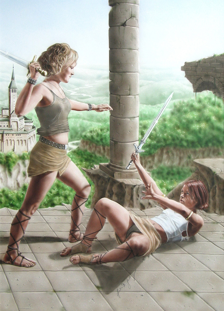 Die Anführerin der Amazonen, Keena, holt zum tödlichen Schlag gegen ihre Konkurrentin Shaila aus
