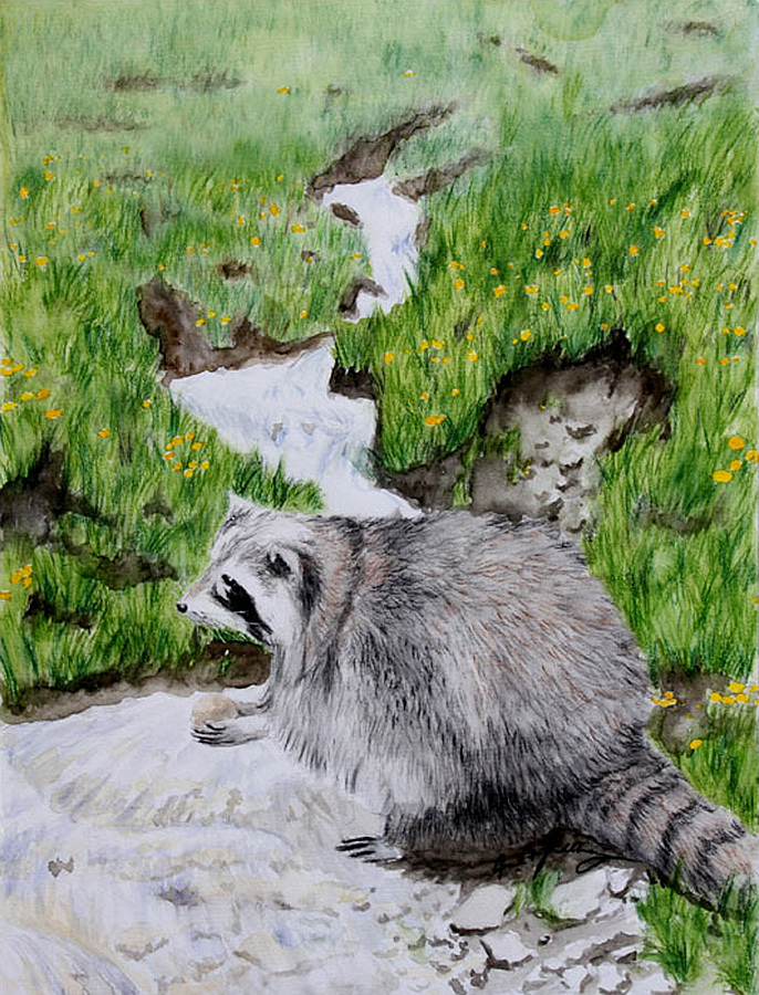 Der Waschbär war gerade damit beschäftigt, ein paar Kartoffeln, die er gesammelt hatte, eifrig in dem Bach zu waschen.