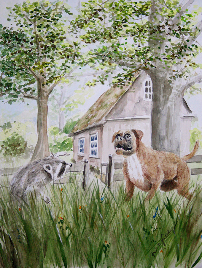 Da sauste etwas Grauschwarzes an ihr vorüber, baute sich zwischen ihr und dem heranstürmenden Hund auf und zischte diesen drohend an. Es war ihr freundlicher Führer, der kleine Waschbär! Er zeigte keinerlei Furcht, obwohl der Hund größer war als er selbst. |